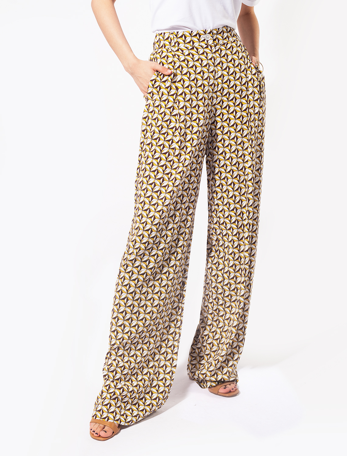 Брюки-палаццо из премиальной вискозы. Широкие брюки палаццо - настоящий тренд летнего сезона. Воздушные и струящиеся в пол - эта деталь гардероба точно придаст женственного шарма в ваш повседневный образ. Высокая посадка - визуально вытянет силуэт, а оригинальный принт задаст настроение вашему образу. Для создания комплекта используйте блузку D29.719. Сочетайте брюки палаццо с джемперами, футболками и рубашками. 100%Вис