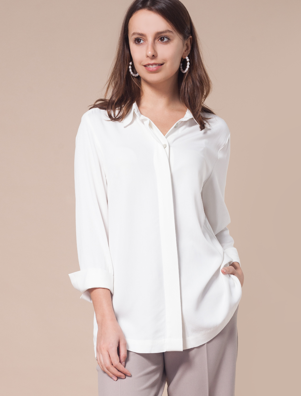 Прямая блузка из премиальной вискозы с рукавом 7/8. Благодаря фактуре ткани достигается эффект расслабленного образа, что очень актуально в летнем гардеробе. Модель дополнена воротником и пуговицами. Свободный крой подойдет любому типу фигуры. 100%Вис