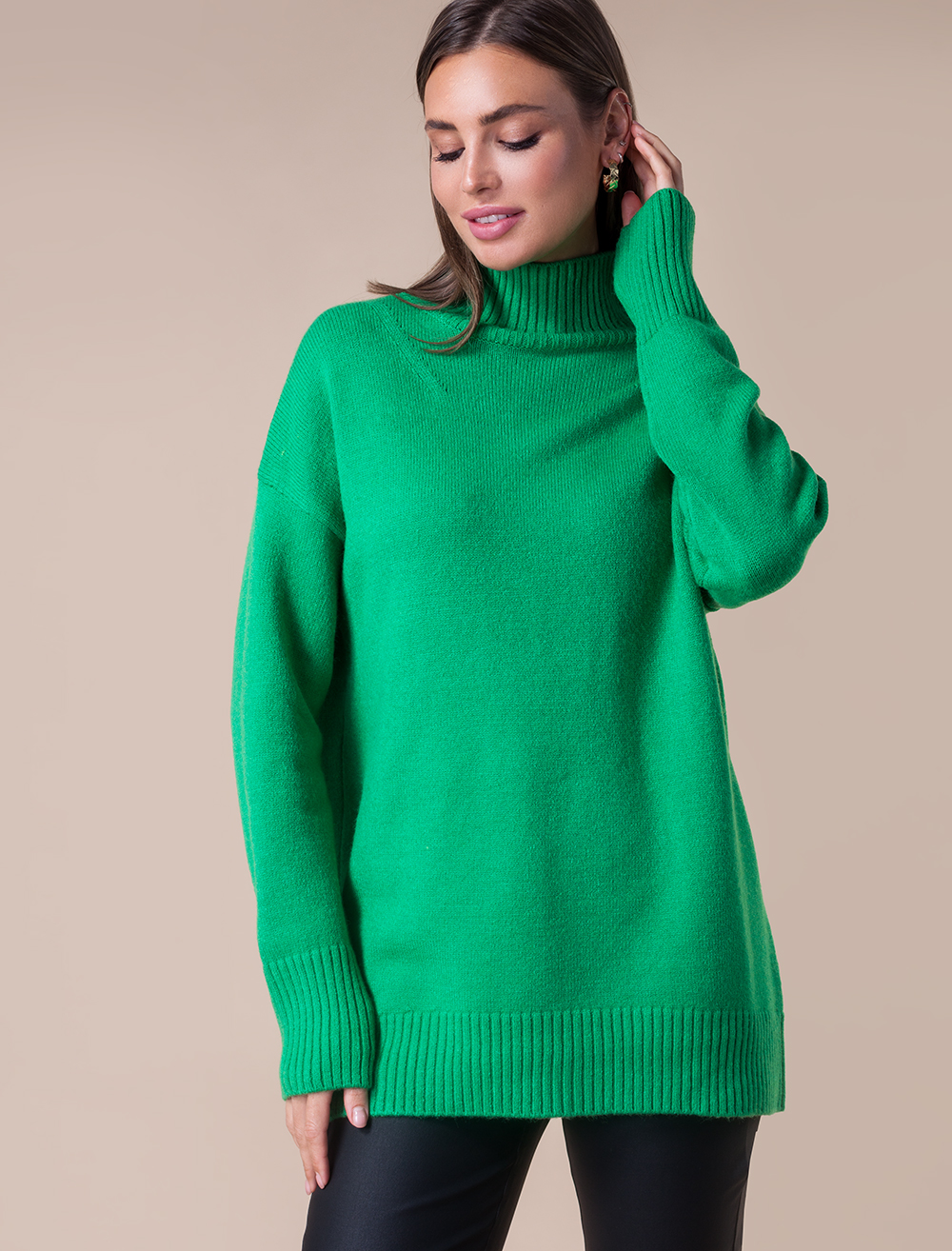 Уютный свитер овер-сайз из теплой пряжи с кашемиром в супер-трендовом зеленом оттенке. Свободный удлиненный силуэт подходит любому типу фигуры. Наличие ПЭ в составе изделия - обеспечивает формоустойчивость и долговечность изделия.