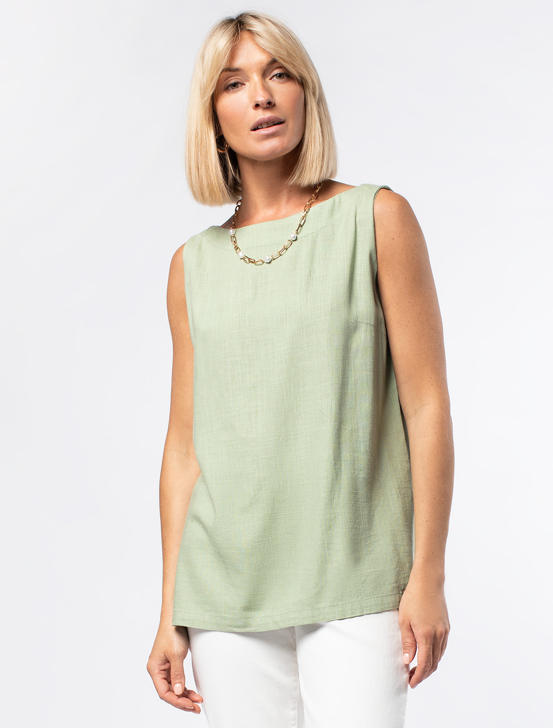 Топ сшит из дышащей легкой ткани в составе которой лен с добавлением шелковистых нитей вискозы. Смесовая ткань не мнется и отлично пропускает воздух, быстро впитывает влагу. Вырез горловины в форме "лодочка". По бокам два разреза с фирменным логотипом бренда. Простой крой в духе минимализма и богемной роскоши подходит любому типу фигуры. Идеально сочетается в костюме с брюками D24.489 и юбкой D26.430 70%Вис 30%Лен