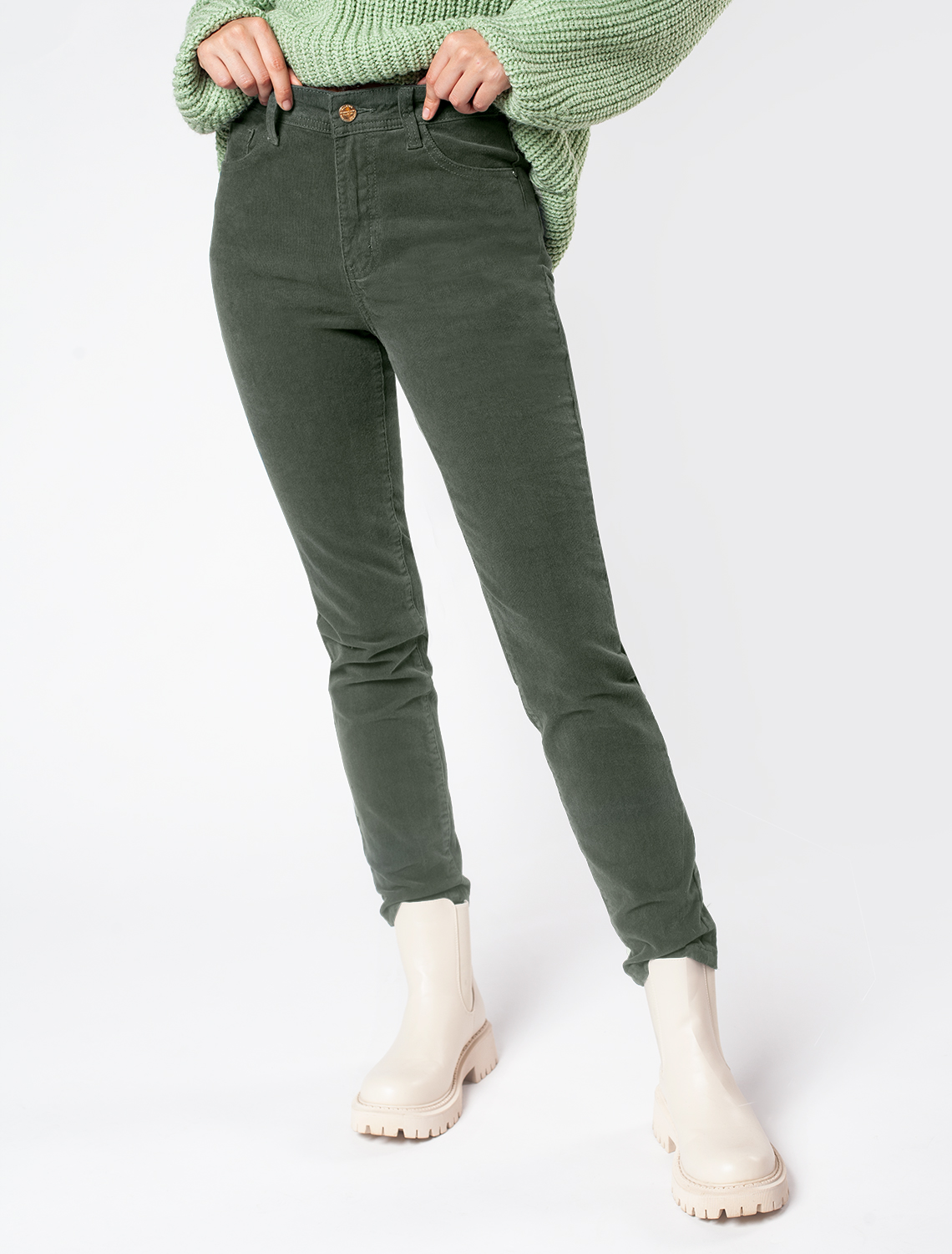 Джинсы выполнены из эластичного микро-вельвета. Плотный и мягкий материал почти не мнется и не теряет форму даже после многочисленных стирок. Зауженный крой подчеркивает фигуру, а высокая посадка акцентирует талию. Как и в классических джинсах, модель дополнена высококачественной фурнитурой, застежкой на молнию и карманами для удобства. 98%Хлопок 2%ПУ
