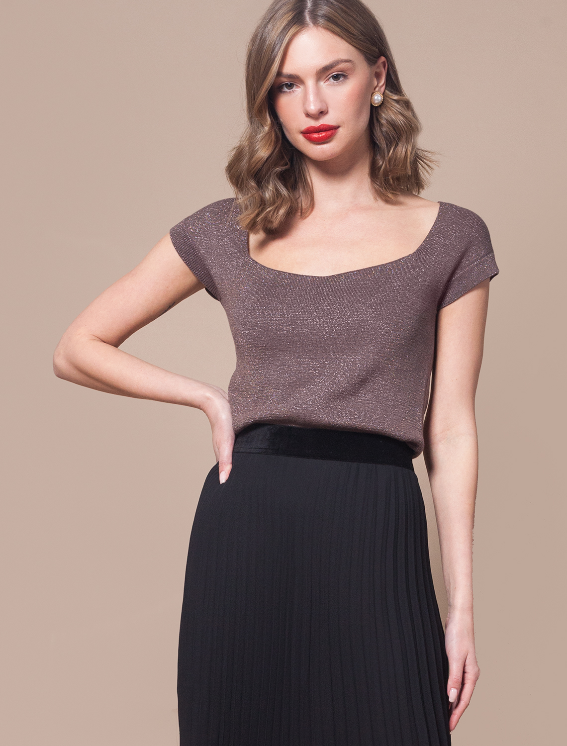 Нарядный топ с люрексом эластичной вязки. Облегающий джемпер с трендовым вырезом горловины выполнен в универсальном кофейном цвете. Вырез акцентирует зону декольте и визуально вытягивает силуэт. Данный крой подчеркивает силуэт и достоинства вашей фигуры. 60%Хлопок 40%Вис