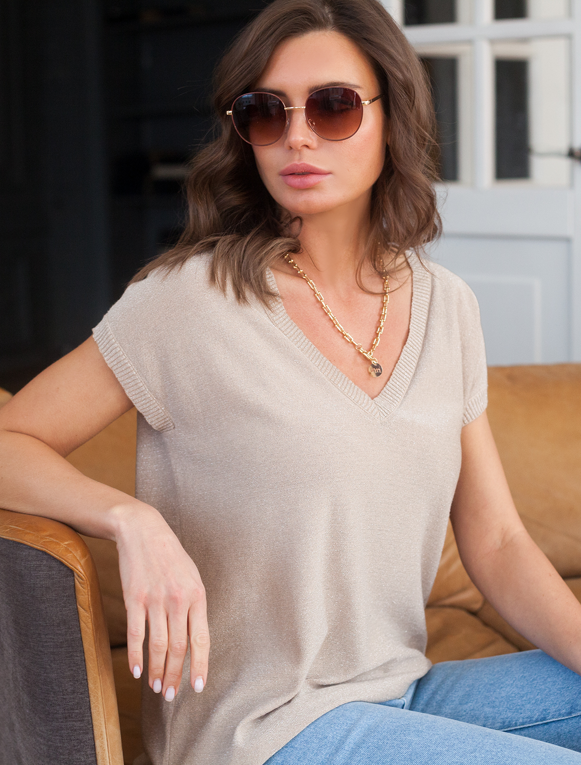 Джемпер нарядной тонкой вязки с люрексом. Свободный крой подходит для фигуры любого типа. Отлично скрывает недостатки и подчеркивает достоинства. Модель нейтрального бежевого оттенка дополнена V-образным вырезом и небольшими разрезами по бокам. 60%Хлопок 40%Вис