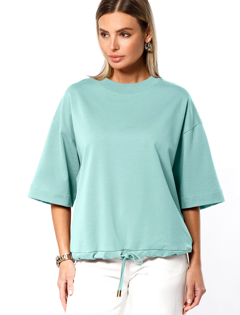 Свободная футболка выполнена из тонкого хлопкового футера. Низ изделия регулируется шнуром с золотистой фурнитурой. Материал хорошо пропускает воздух, а за счет эластана в составе не теряет форму даже после частых стирок. Сочетается в костюме с брюками D44.040, D44.041 и шортами D48.003 92%Хлопок 8%ПУ