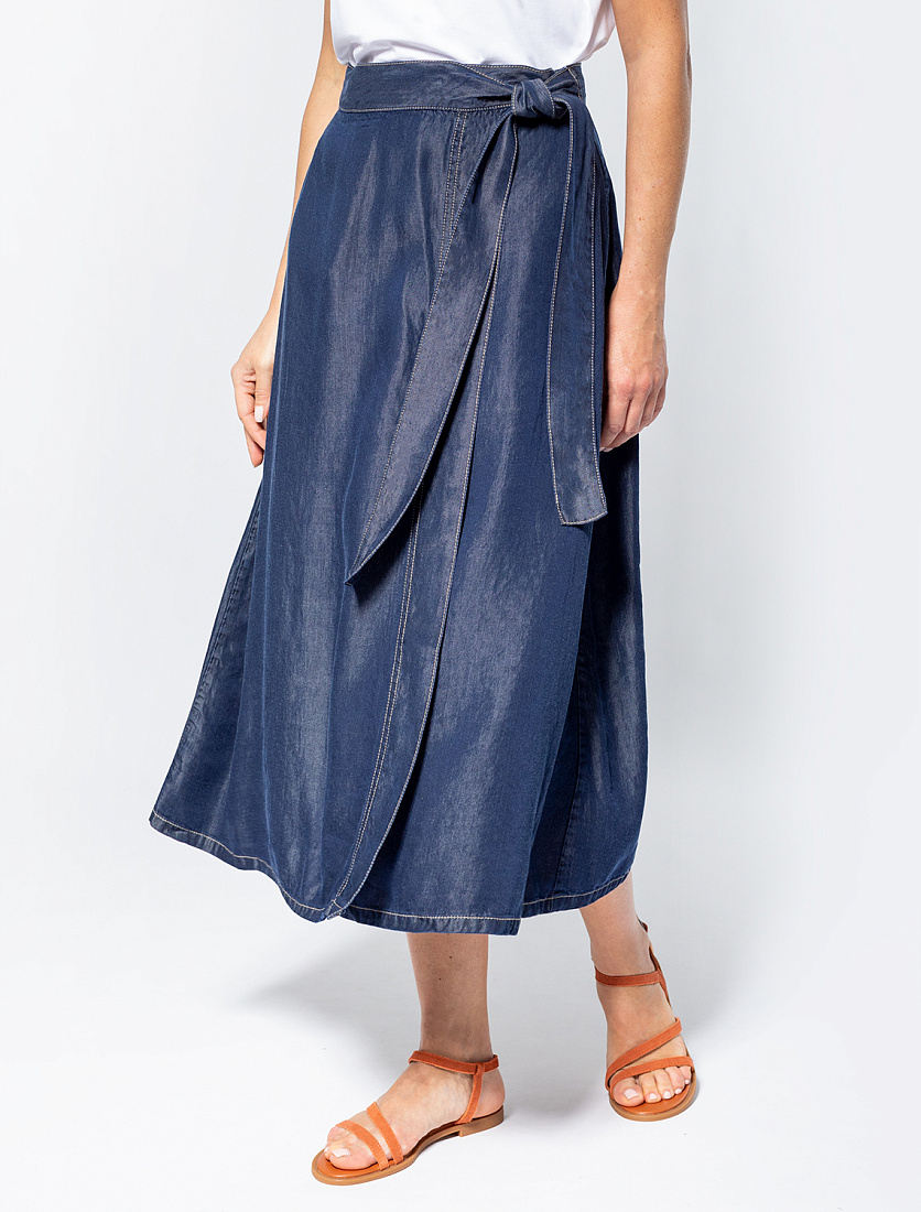 Юбка с запАхом выполнена из струящегося 100% лиоцелла. Деним из такого материала обладает особой мягкостью и прочностью. Имеет полуматовый блеск, как у натурального шелка. Отлично холодит кожу в жаркое время года, сохраняя комфортный микроклимат. Глубокий синий цвет без стирки дополнен золотистой фурнитурой в стиле old-money. Сочетается в костюме с жакетом D51.030 100%Лиоцелл (Вис)