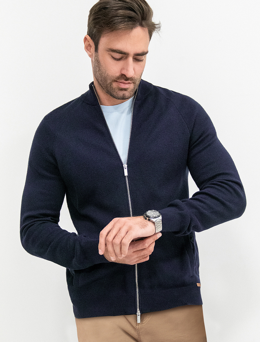 Темно-синий джемпер с длинными рукавами поддержит образы любой палитры и сложности. За многофункциональность отвечают лаконичный крой и застежка на молнию. Изделие связано из премиального хлопка с добавлением акрила, которые не дадут замерзнуть в прохладный день на улице, но при этом не перегревает в помещении. 55%Хлопок 45%ПАН (акрил)