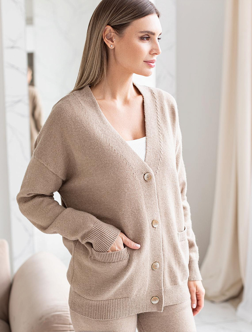 Кардиган со спущенной линией плеча и V-образным вырезом выполнен из мягкой пряжи с добавлением кашемира. Изделие из такого материала хорошо сохраняет тепло, при этом не перегревая, и особенно приятно ощущается на коже, поэтому его комфортно носить даже на голое тело. Переплетение нитей разных оттенков создает деликатный меланжевый узор. Отдельным украшением служит металлический логотип бренда. 52%ПАН (акрил) 33%ПЭ 8%ПУ 7%Кашемир