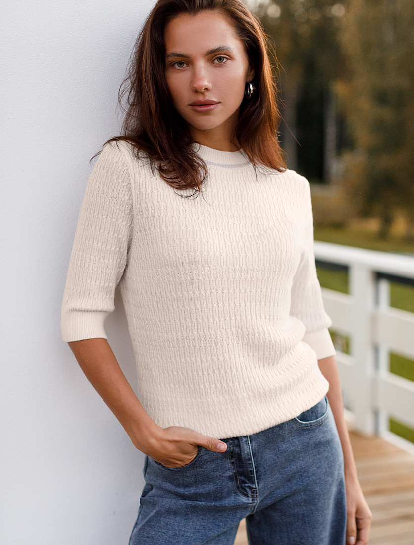 Джемпер тонкой вязки выполнен из хлопка с вискозой. Нежную пряжу, очень приятную к телу, дополняет ажурный узор - плетение косы напоминающие звенья колец. Горловина украшена вязаным чокером контрастного цвета с добавлением мягкого люрекса. Идеальное решение для весны и лета в офис или повседневный аутфит. Комфортная длина и крой подходят для любой фигуры. 60%Хлопок 30%Вис 10%ПА