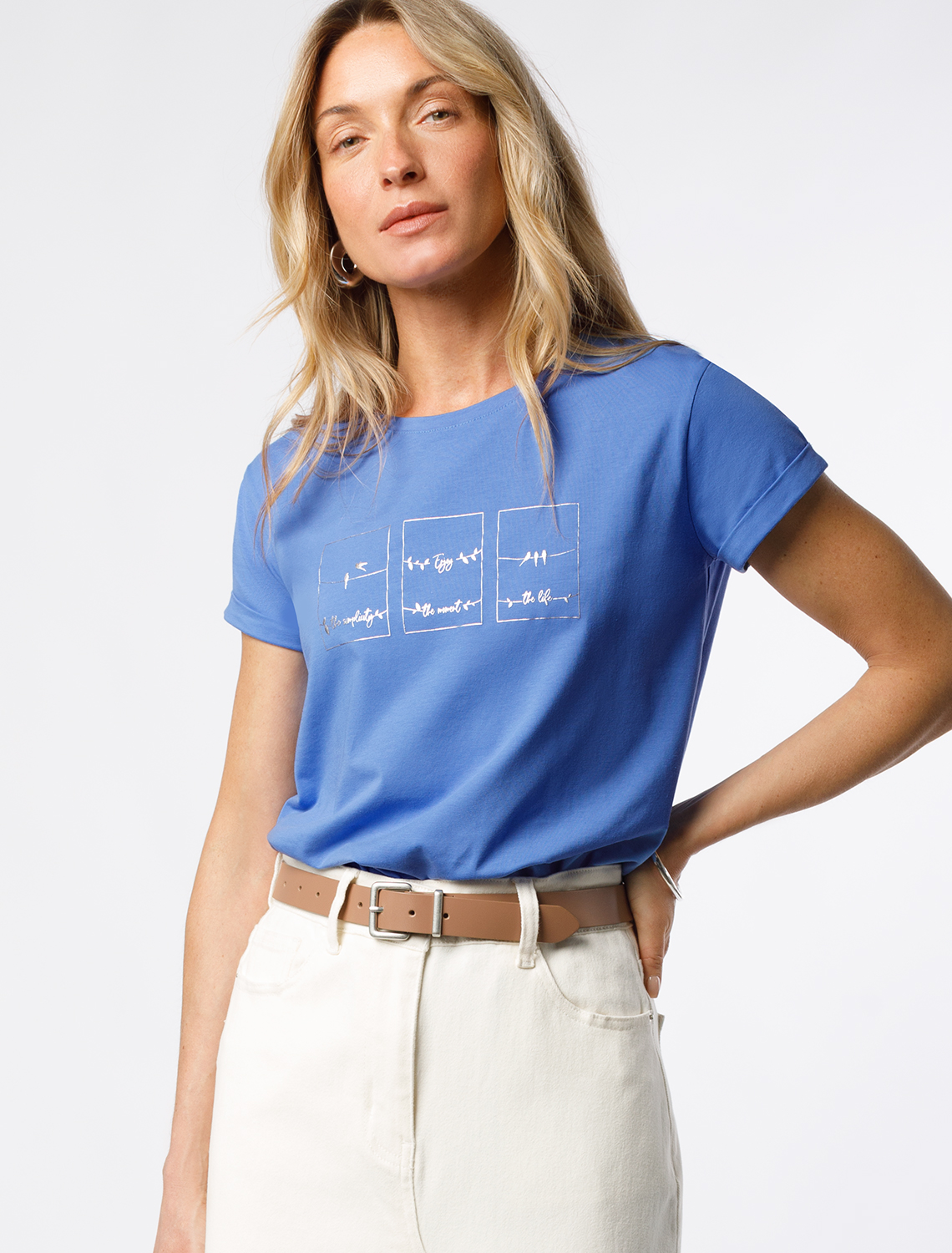 Перевод принта: Enjoy the simplicity, the moment, the life - наслаждайся простотой, моментом, жизнью. Футболка выполнена из премиального хлопка с эластаном. Авторский принт нанесен красками с устойчивым покрытием. Модель среднего объема дополнена подворотами на рукавах. Легко впишется в повседневные аутфиты и добавит акцента в образы. Изделие дополнено металлическим логотипом бренда. 92%Хлопок 8%ПУ