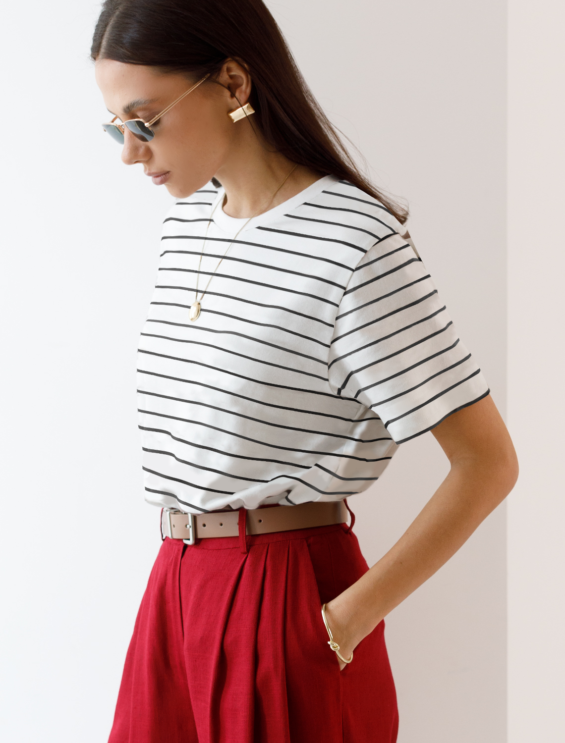 Футболка выполнена из премиального хлопка. Наличие эластана гарантирует абсолютный комфорт и долговечность изделия. Модель в полоску предлагаем сочетать с однотонными вещами базовой палитры. Изделие дополнено металлическим логотипом бренда. 92%Хлопок 8%ПУ
