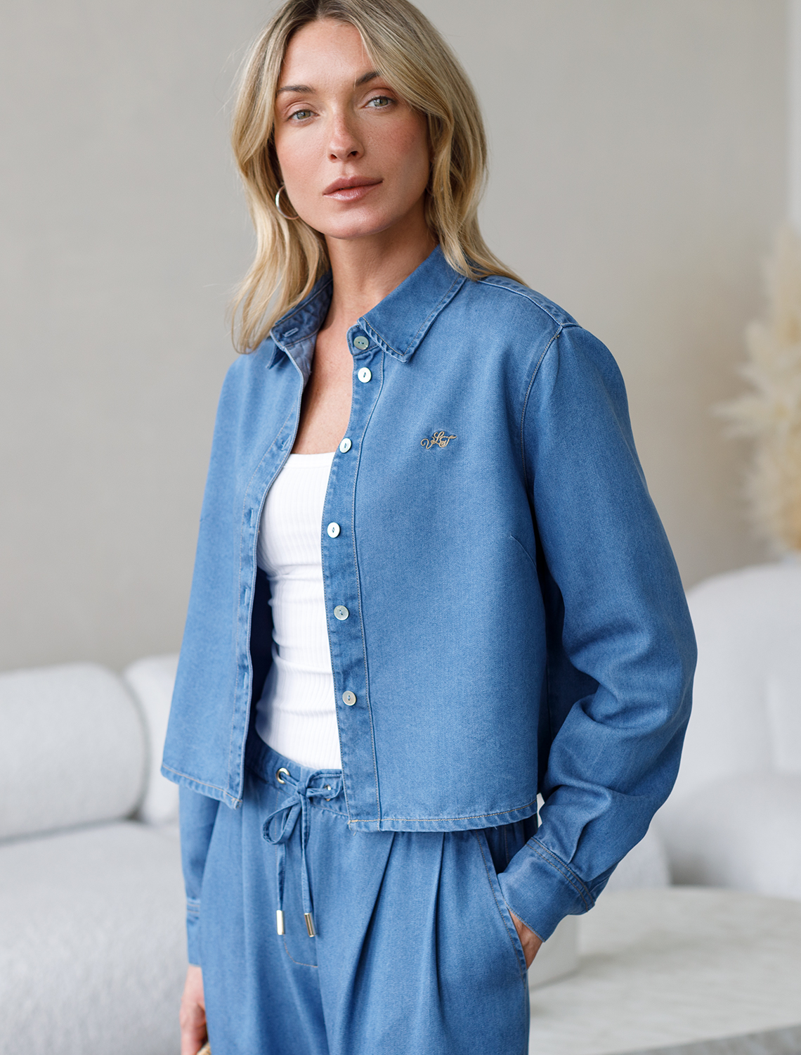 Укороченная блузка с вышитым логотипом выполнена из лиоцелла. Изюминкой служит необычная спинка изделия с застежкой на запАх и завязками из основного полотна. Ткань с характерным атласным блеском полностью имитирует обычный деним, но в тоже время намного более мягкая, плавно струится по телу, хорошо драпируется и охлаждает кожу в жаркое время года. Изделие сочетается в костюме с брюками D54.146, D54.150 и юбкой D56.116 60%Лиоцелл (Вис) 36%ПЭ 4%Вис