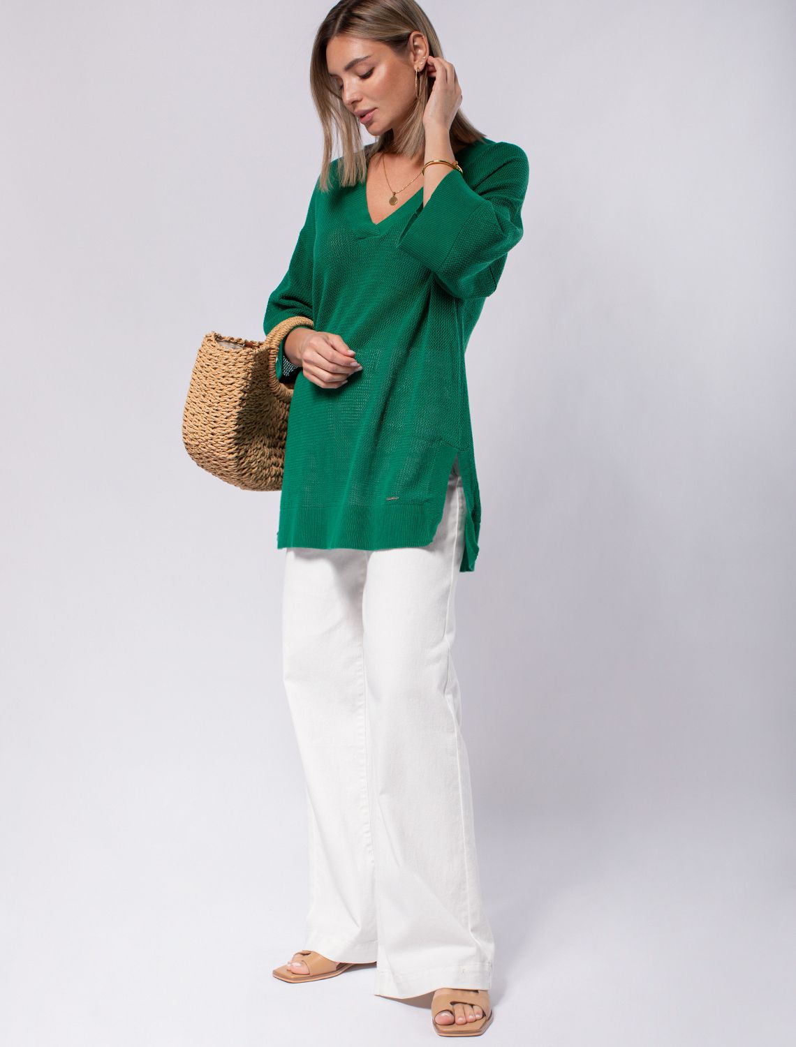 Туника полупрозрачной вязки выполнена из мягкой пряжи на основе хлопка с вискозой. Идеально подойдет в жару, защитит от палящего солнца и при этом не будет перегревать тело. Отлично сочетается с мини-топом или с купальником. В обычной жизни хорошо аккомпанирует с денимом и льном. Изделие дополнено металлическим логотипом бренда. 60%Хлопок 40%Вис
