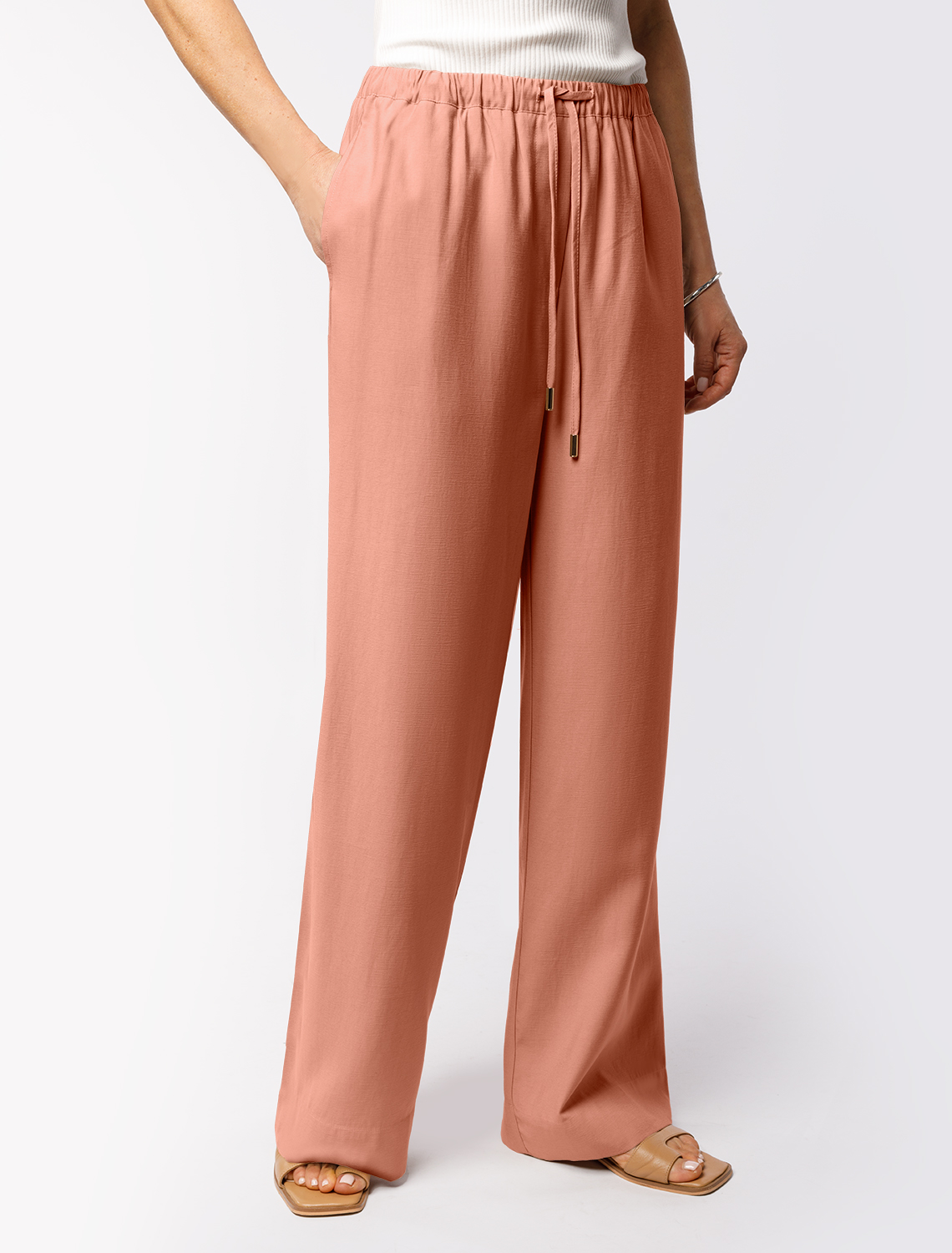 Брюки свободного кроя выполнены из плотного лиоцелла. Модель дополнена карманами и поясом с эластичной резинкой и регулируемым шнурком с золотистой фурнитурой. Ткань изделия отлично держит форму, плавно драпируется и не просвечивает. В теплое время года приятно охлаждает кожу. Добавление синтетических волокон в составе изделия, предотвращает сминаемостьи поддерживает формоустойчивость. Брюки сочетаются в костюме с топом D23.063, блузкой D29.266, D29.267 и жилетом D27.002 70%Лиоцелл (Вис) 30%ПЭ