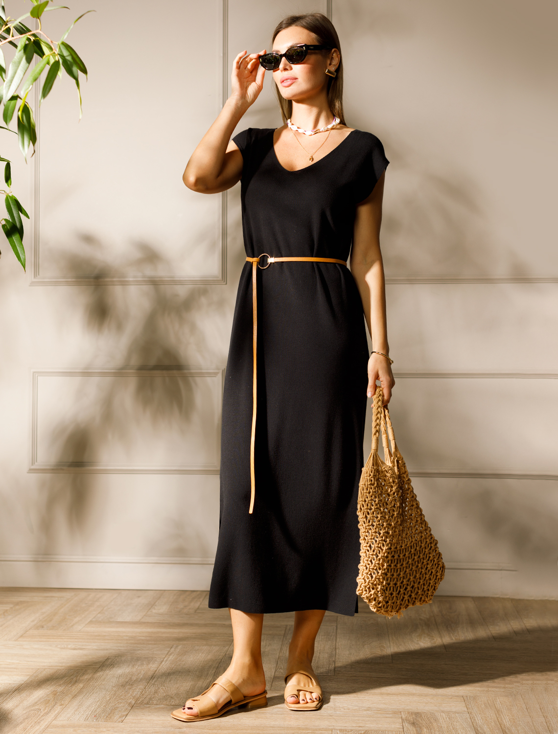 Тонкое платье прямого силуэта со спущенным плечом, связанное из вискозы плетением интерлок. В комплект идет ремешок из искусственной замши. Модель дополнена боковым разрезом и металлическим логотипом бренда. Мягкая пряжа очень приятная к телу идеально подходит в теплое время года. Длина изделия ниже колена. 83%Вис 17%ПА