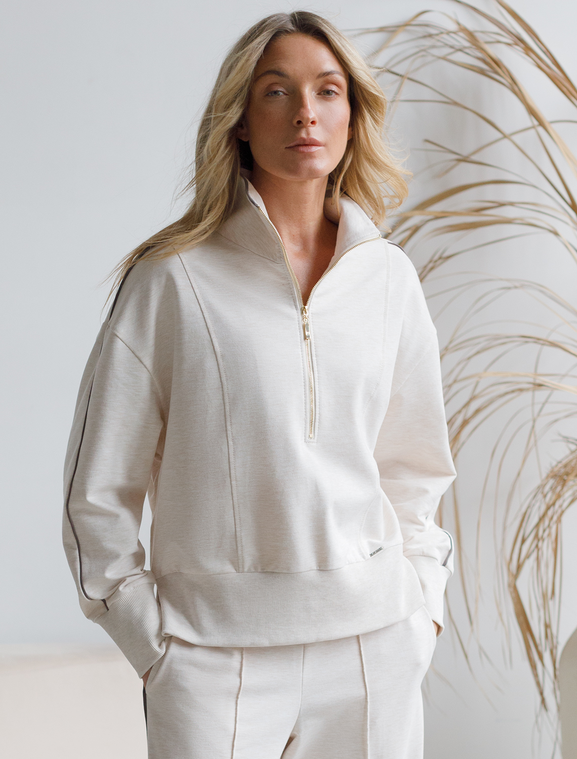 Джемпер с воротом на молнии выполнен из эластичного футера двухнитки. Модель умеренно свободного кроя. По рукавам и воротнику кант из футера контрасного цвета. Изделие дополнено золотистым логотипом бренда. Сочетается в костюме с брюками D44.141, D44.142, шортами D48.009 и юбкой-шортами D46.041 95%Хлопок 5%ПУ