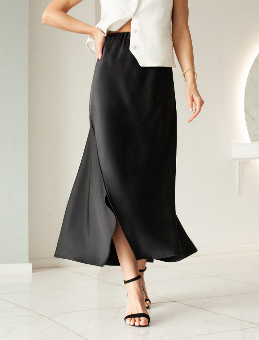 Юбка на запАх, кроеная по косой выполнена из струящегося сатина напоминающий натуральный шелк. Пояс на потайной эластичной ленте без сборок. Лаконичная модель восхитительно струится по ногам моментально создавая праздничное настроение. Сочетайте в костюме с топом D23.061 и блузкой D29.255 или вязаным трикотажем с пайетками или люрексом. 97%ПЭ 3%ПУ