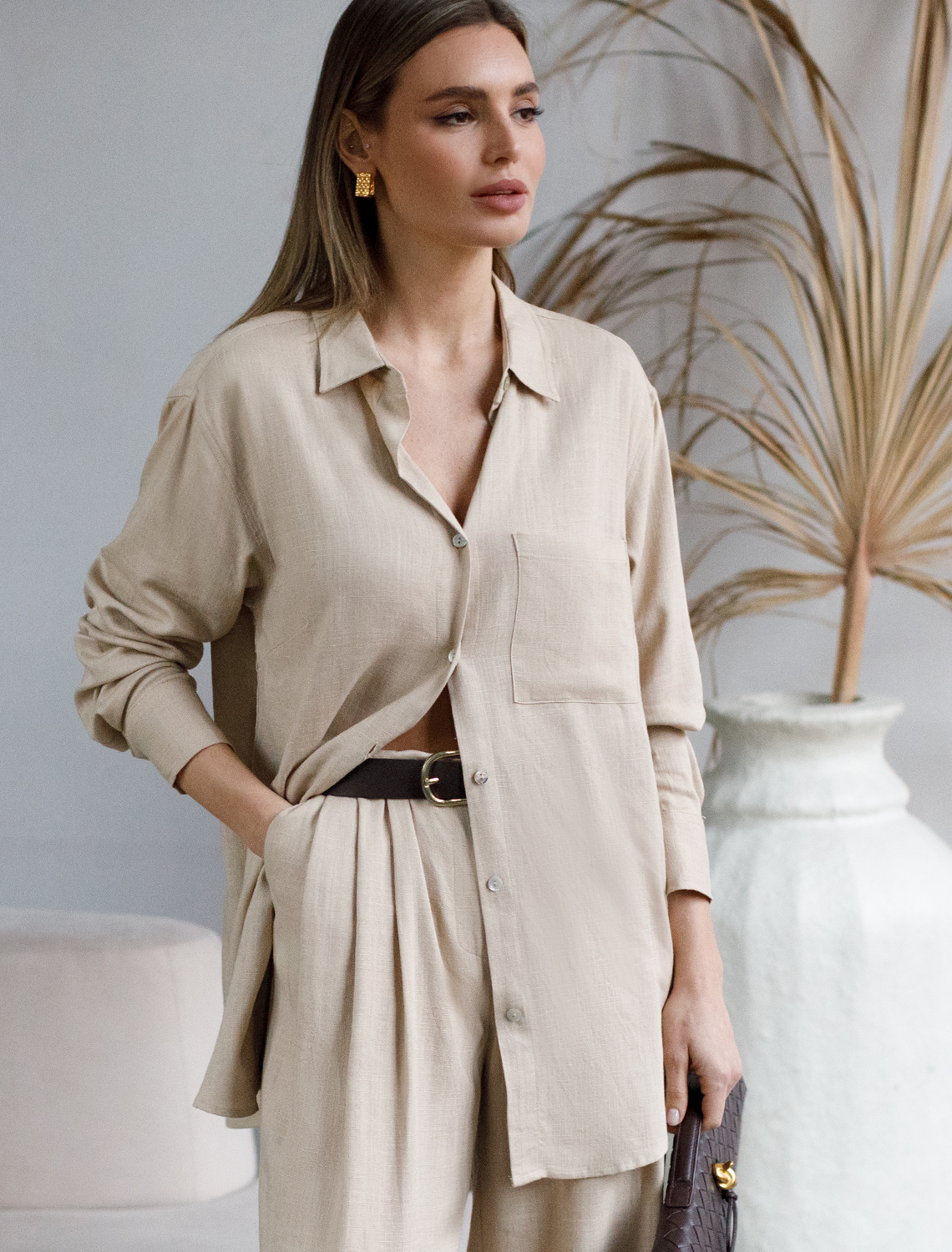 Блузка выполнена изо льна с вискозой. Модель с застежкой на пуговицы из натурального перламутра дополнена сольным карманом. Сочетается в костюме с брюками D24.222 и шортами D28.052. Ткань изящно струится, почти не мнется и сохраняет форму в течении долгого времени, обладает высокой воздухопроницаемостью, обеспечивая комфорт даже в самое жаркое время года. 70%Вис 30%Лен
