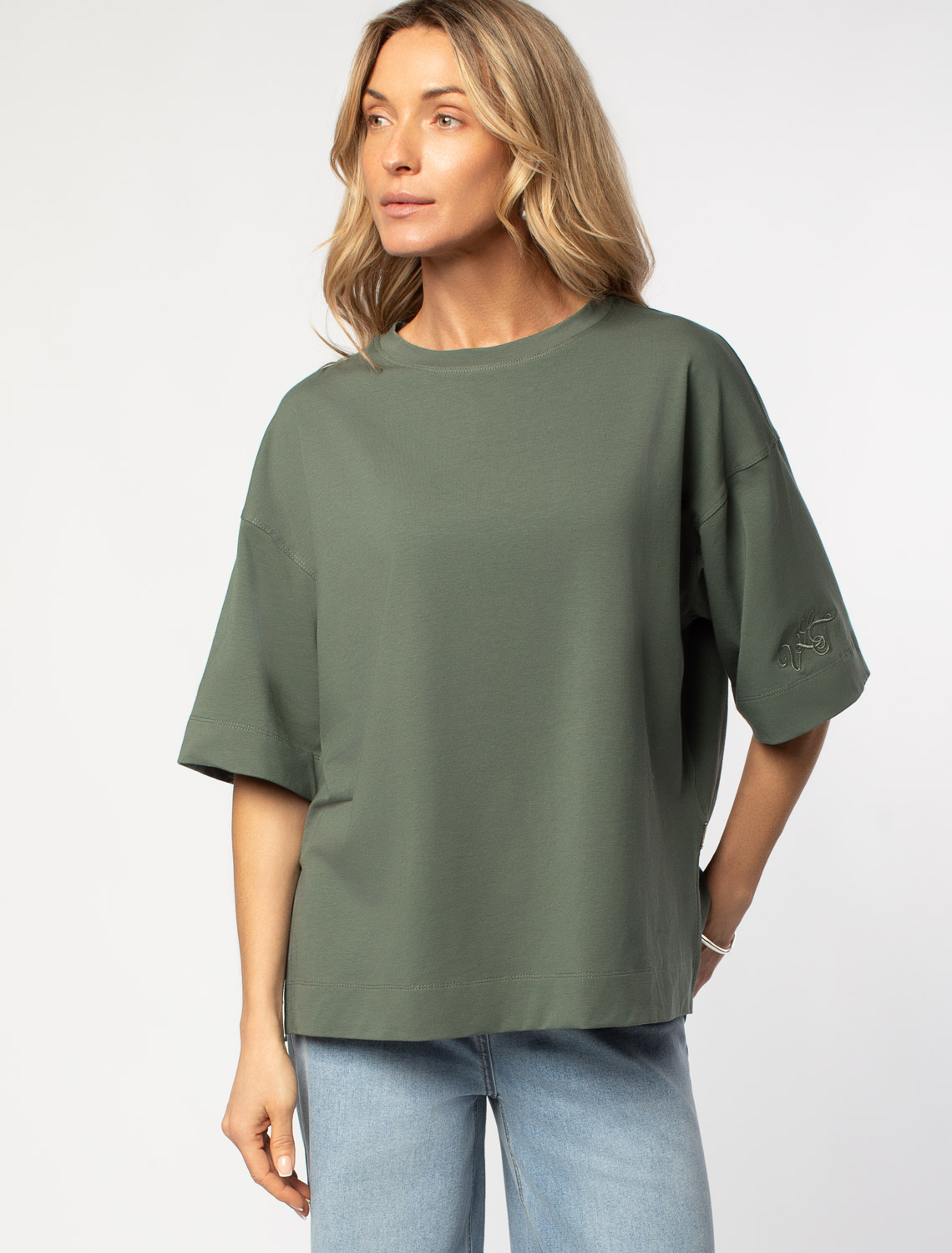 Футболка свободного кроя выполнена из премиального хлопка. Модель дополнена вышивкой логотипа бренда на рукаве. Наличие эластана в составе изделия гарантирует комфорт и формоустойчивость. Подходит для любого типа фигуры. 92%Хлопок 8%ПУ
