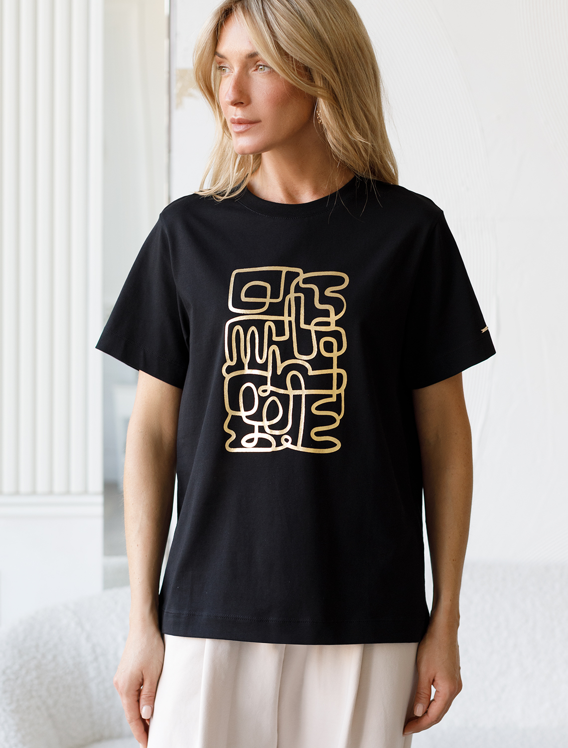 Футболка выполнена из премиального хлопка. Авторский принт нанесен фактурными красками с устойчивым покрытием. Наличие эластана в составе гарантирует комфорт и формоустойчивость. Изделие дополнено фирменным металлическим логотипом бренда. 92%Хлопок 8%ПУ