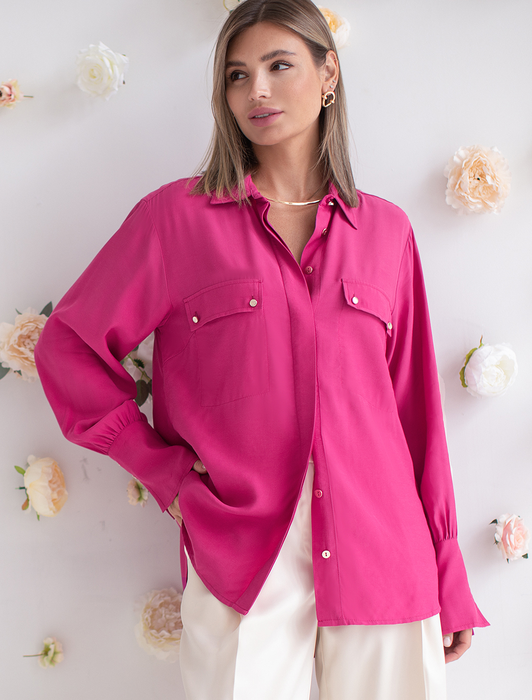 Блузка с имитацией карманов и удлиненными манжетами выполнена из премиальной вискозы и лиоцелла. На спинке изделия фирменный логотип бренда. Имитация карманов позволяет этому элементу выглядеть аккуратно без складок и фалд, которые вероятны на такой пластичной ткани. Застежка на золотистые пуговицы. Приятная на ощупь ткань охлаждает кожу в жаркую погоду. Отлично впишется в нестрогий офисный дресс-код или в расслабленном повседневном образе с джинсами. 55%Вис 45%Лиоцелл (Вис)
