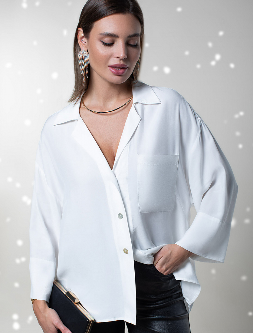 Удлиненная блузка свободного кроя выполнена из премиальной вискозы и лиоцелла. Застежка на пуговицы из натурального перламутра. Приятная на ощупь ткань охлаждает кожу в жаркую погоду. Отлично впишется в нестрогий офисный дресс-код или в расслабленном повседневном образе с джинсами и юбками. На спинке фирменный логотип бренда.