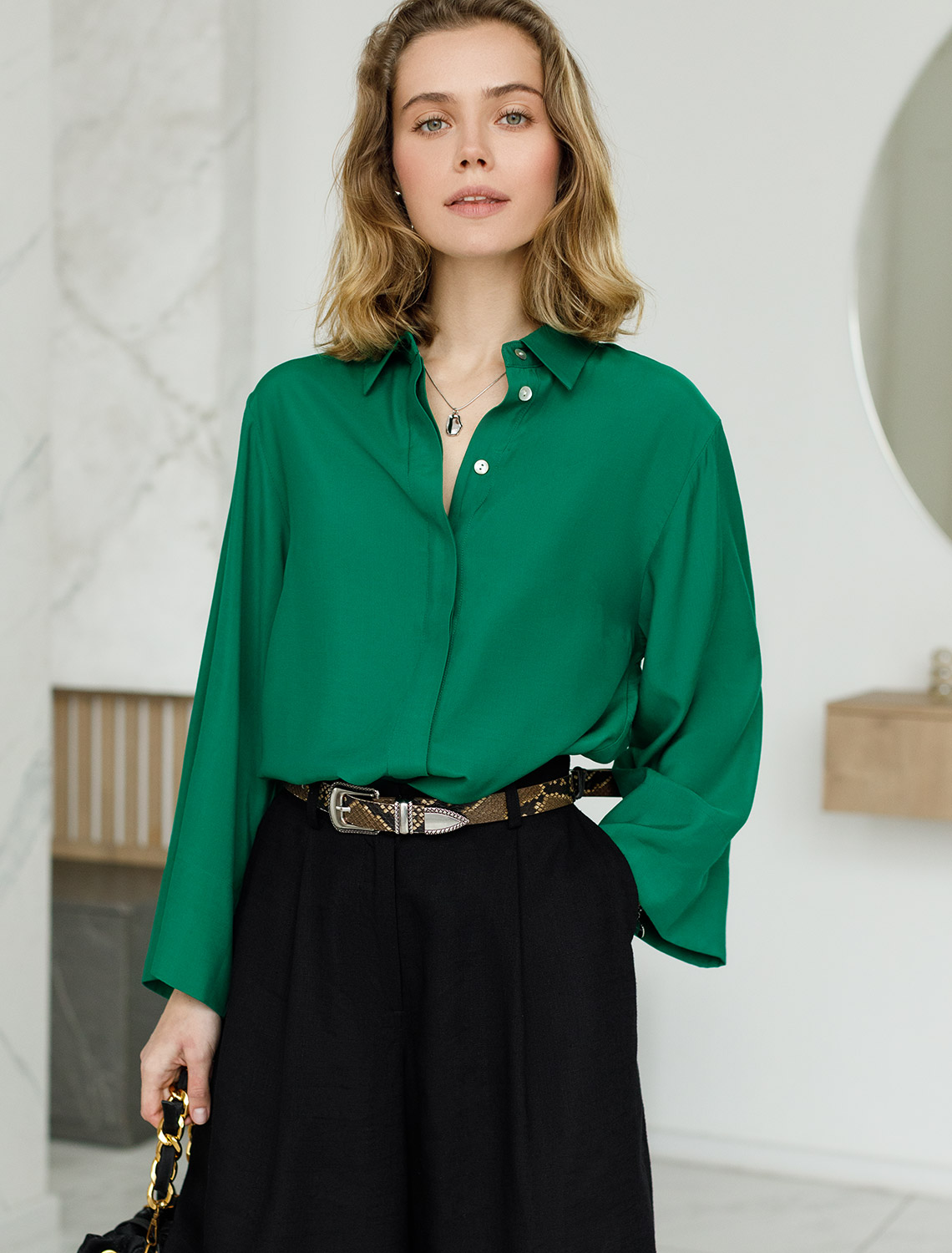 Блузка с отложным воротником и свободными укороченными рукавами выполнена из лиоцелла с вискозой. Лаконичная модель без декора, дополнена застежкой на пуговицы из натурального перламутра под планкой. Просторный крой не стесняющий движений подходит для любой фигуры с не широкими низами в заправку или поверх. 55%Вис 45%Лиоцелл (Вис)