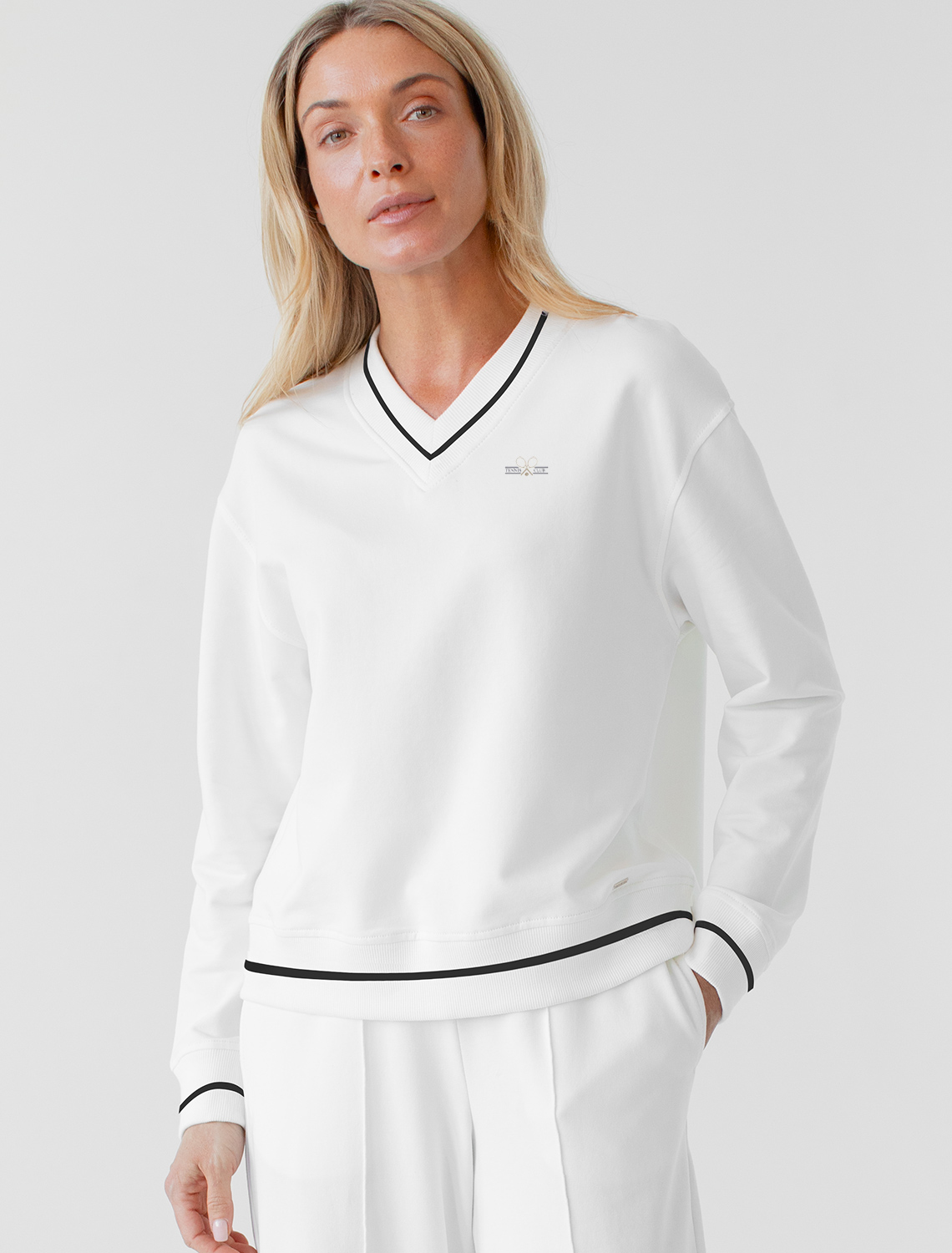 Перевод принта: Теннисный клуб. Джемпер умеренного объема с V-вырезом выполнен из эластичного футера двухнитки. Горловина, манжеты и пояс выполнены из эластичного хлопка с контрастной полосой. Изделие дополнено золотистым логотипом бренда. Сочетается в костюме с брюками D44.141, D44.142, шортами D48.009 и юбкой-шортами D46.041 95%Хлопок 5%ПУ