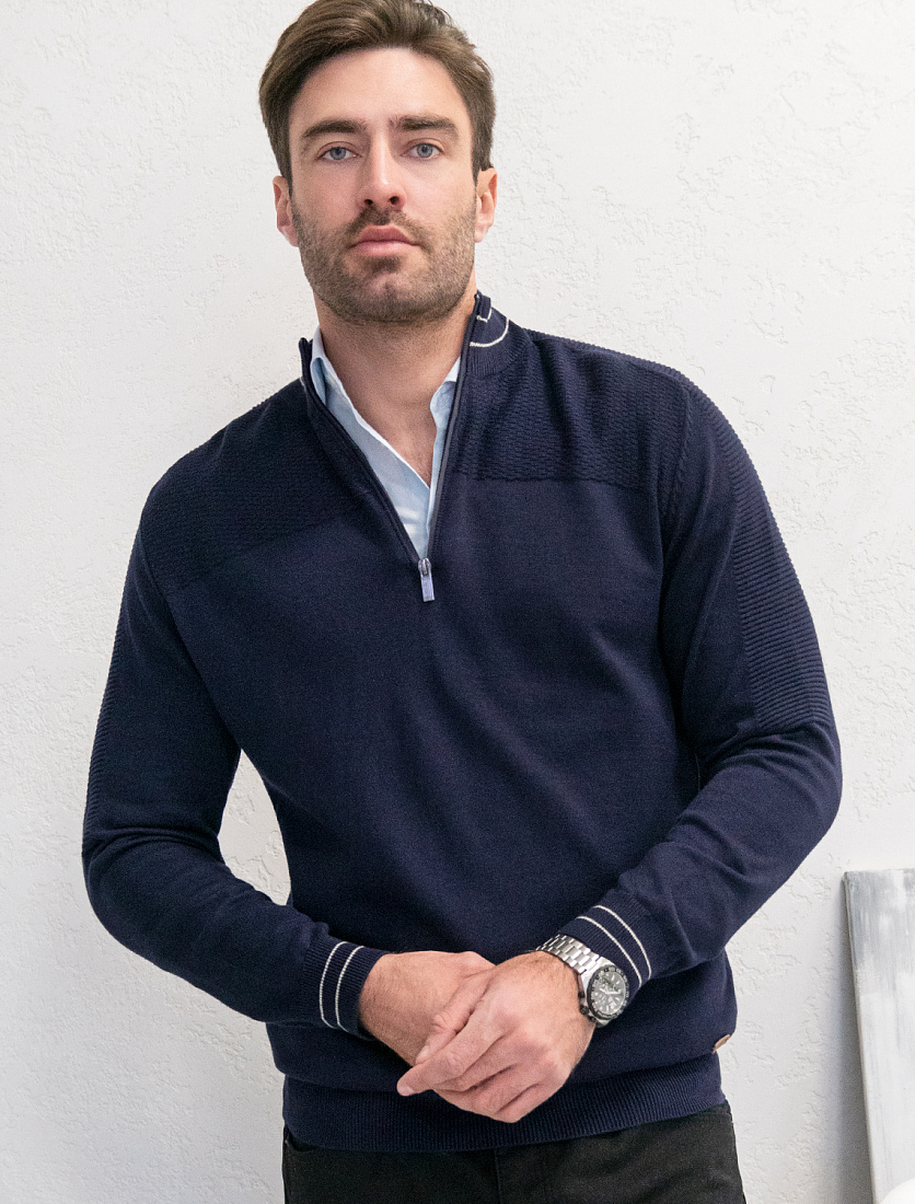 Лаконичный джемпер темно-синего оттенка. Для изготовления модели использовали тонкую пряжу из длинноволокнистого хлопка премиального качества. Он мягче, прочнее и эластичнее обычного, а на ощупь очень нежный, поэтому вещь комфортно садится по фигуре и особенно приятно ощущается на теле. Модель дополнили вставками в рубчик по плечам и короткой молнией, благодаря которой изделие с высоким воротом удобно надевать и снимать через голову. 55%Хлопок 45%ПАН (акрил)
