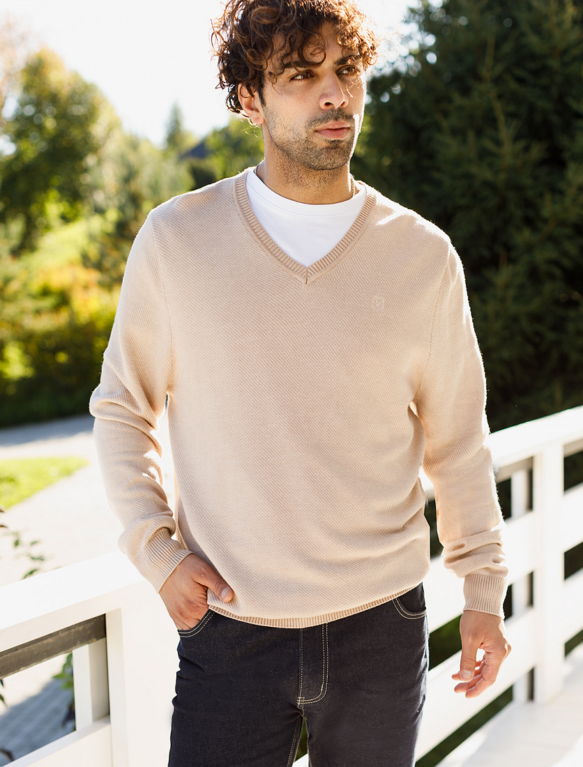 Для изготовления бежевого джемпера с клиновидным вырезом и длинными рукавами использовали пряжу из премиального хлопка с акрилом. У модели получилась очень мягкая и приятная на ощупь фактура из переплетения нитей нескольких цветов. Изделие комфортно носить даже на голое тело или дополнив образ футболкой. Роскоши вносит вышитый логотип бренда. 55%Хлопок 45%ПАН (акрил)