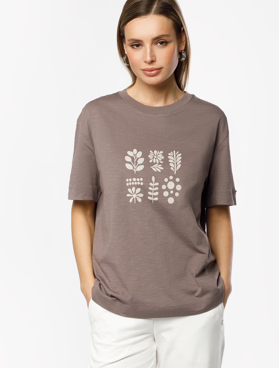 Футболка выполнена из фактурного полотна из 100% хлопка. Модель с лаконичным авторским принтом легко впишется в любой весенне-летний гардероб. Ткань имеет характерный рисунок черточки за счет сочетания разных волокон хлопка 140-150 г. Хорошо держит форму и поддерживает комфортный микроклимат в течении дня. 100%Хлопок