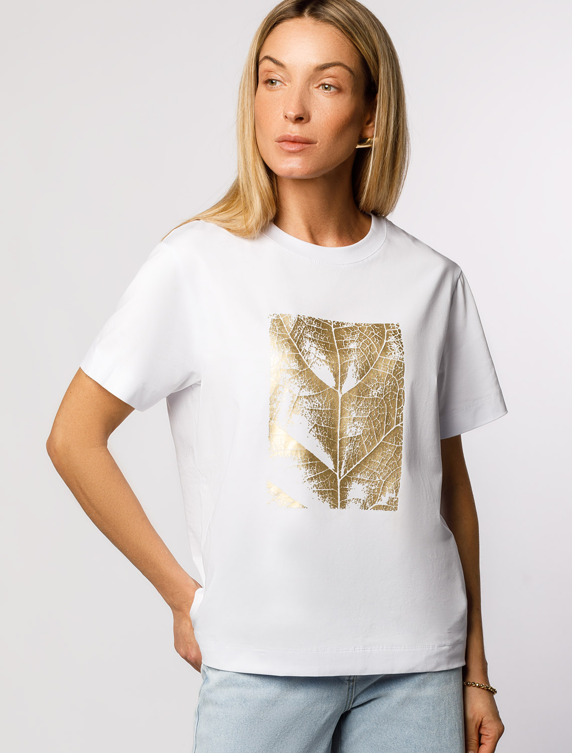 Футболка выполнена из премиального хлопка с эластаном. Авторский принт нанесен золотой фольгой с устойчивым покрытием. Модель среднего объема легко впишется в повседневные аутфиты и добавит акцента в образы. Эластичный материал гарантирует комфорт и формоустойчивость. Изделие дополнено металлическим логотипом бренда. 92%Хлопок 8%ПУ