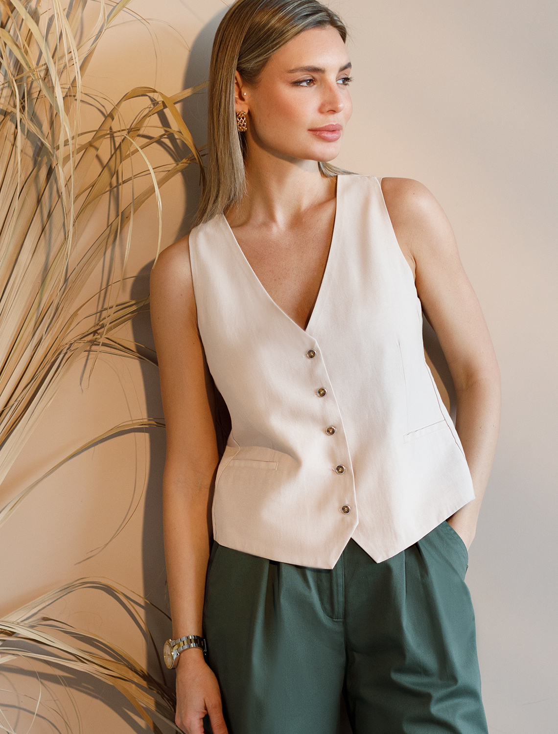 Жилет выполнен из плотного лиоцелла. Модель украшена черепаховыми пуговицами в золотистой окантовке. Ткань изделия отлично держит форму и не просвечивает. В теплое время года приятно охлаждает кожу. Добавление синтетических волокон в составе изделия, предотвращает сминаемость и поддерживает формоустойчивость. Жилет сочетается в костюме с брюками D24.261, D24.267, D24.265, юбкой D24.261, D26.196, шортами D27.002, а также очень эффектно с белыми шортами и джинсами. 70%Лиоцелл (Вис) 30%ПЭ