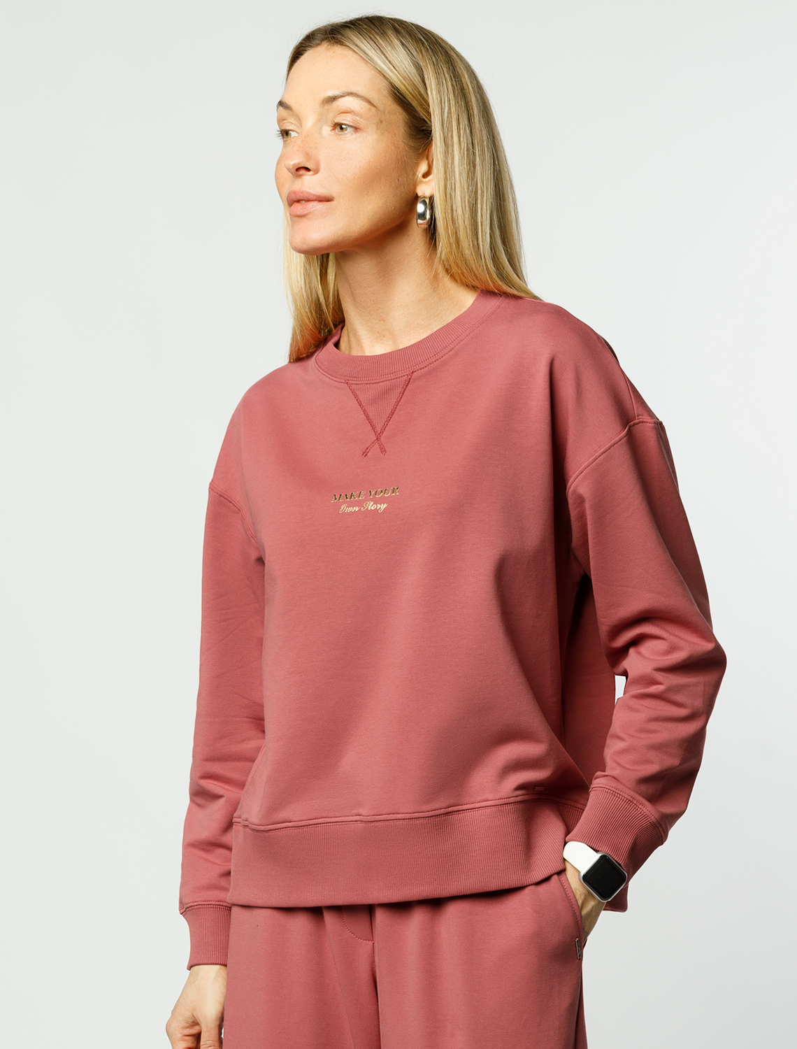 Перевод принта: Make your own story - стань автором своей истории. Джемпер среднего объема со спущенным плечом выполнен из футера двухнитки с эластаном. Принт нанесен фактурной золотой краской. Эластичный материал гарантирует комфорт и формоустойчивость. Сочетается в костюме с брюками D44.138, D44.139 и шортами D48.008. Изделие дополнено металлическим логотипом бренда. 95%Хлопок 5%ПУ