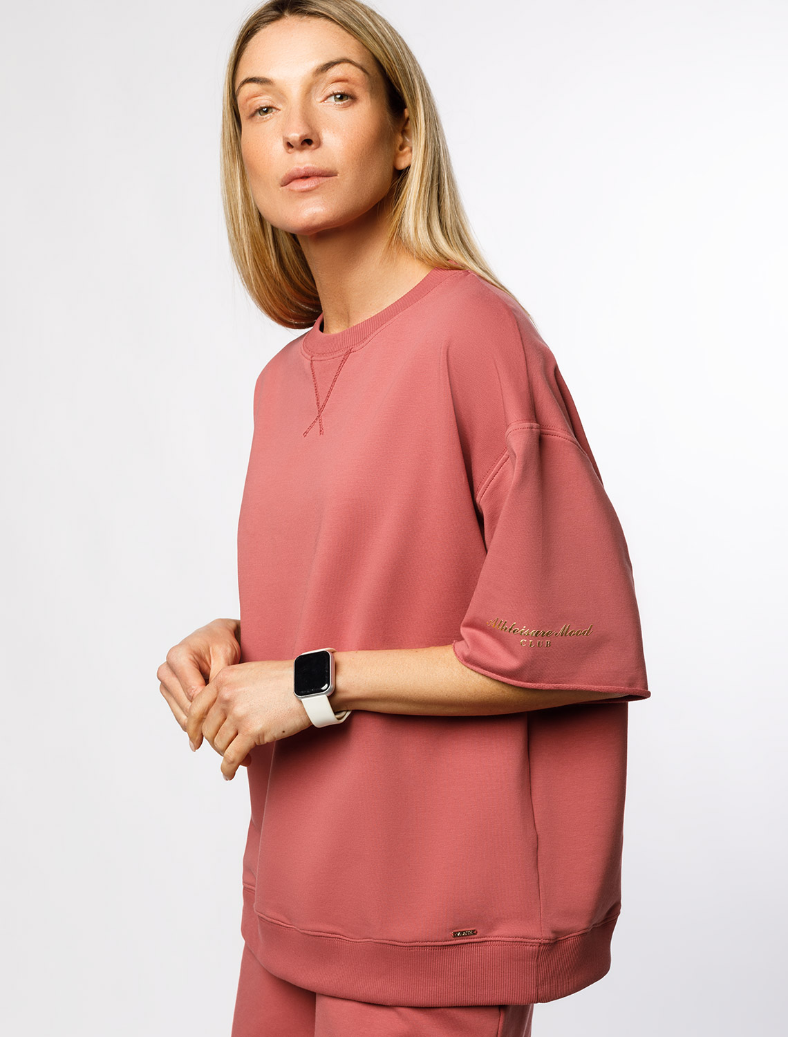 Перевод принта: Athleisure mood club - клуб любителей спортивного стиля. Футболка свободного кроя со спущенным плечом выполнена из футера двухнитки с эластаном. Лаконичный принт нанесен фактурной краской и золотой фольгой. Эластичный материал гарантирует комфорт и формоустойчивость. Сочетается в костюме с брюками D44.138, D44.139 и шортами D48.008. Изделие дополнено металлическим логотипом бренда. 95%Хлопок 5%ПУ