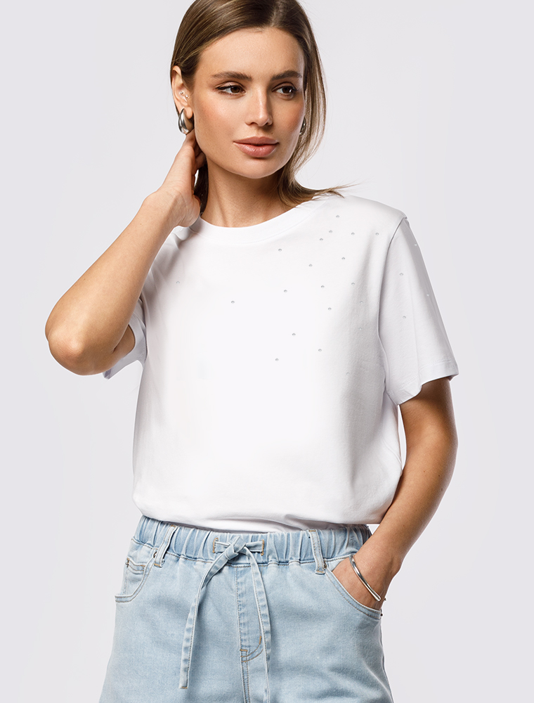 Футболка выполнена из премиального хлопка. Лаконичный принт нанесен россыпью сияющих страз, надежно закрепленных на изделии. Наличие эластана в составе гарантирует комфорт и формоустойчивость. Изделие дополнено фирменным металлическим логотипом бренда. 92%Хлопок 8%ПУ