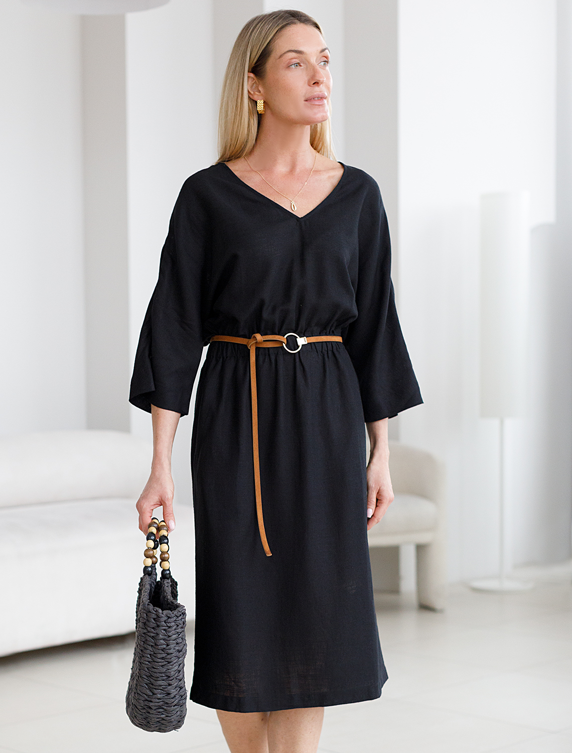 Платье выполнено изо льна с вискозой. Модель с V-вырезом и с цельнокроеным рукавом в стиле кимоно дополнено вшитым поясом из эластичной резинки. В комплект входит ремешок из эко-замши с золотистым кольцом. По бокам два кармана. Лён в составе обеспечивает прочность и воздухопроницаемость, вискоза эластичность и гладкость ткани. Благодаря такому сочетанию изделие хорошо драпируется, меньше мнется и сохраняет форму в течении долгого времени. 70%Вис 30%Лен