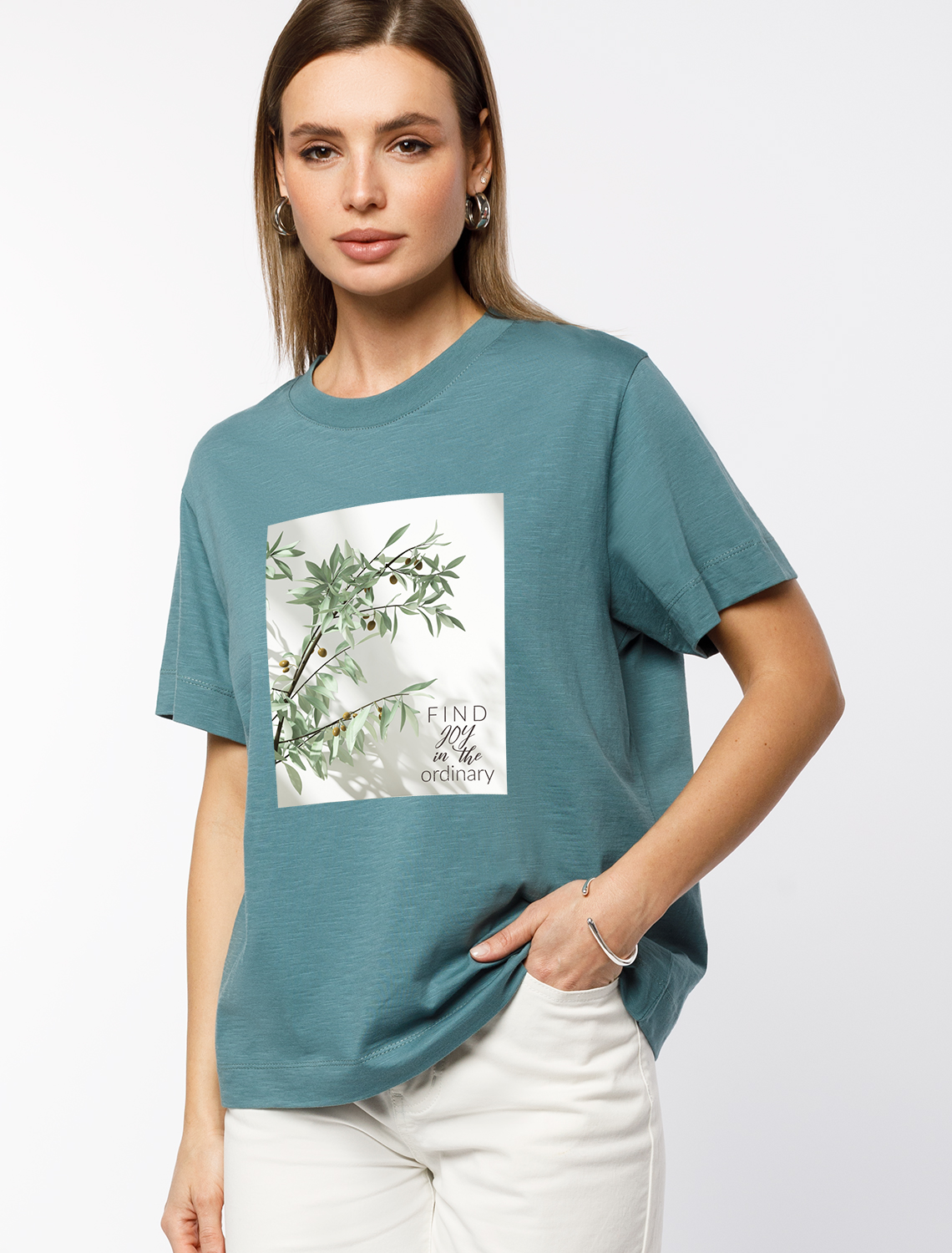 Перевод принта: Find joy in the ordinary - находи радость в мелочах. Футболка выполнена из фактурного полотна из 100% хлопка. Модель с лаконичным авторским принтом легко впишется в любой весенне-летний гардероб. Ткань имеет характерный рисунок черточки за счет сочетания разных волокон хлопка 140-150 г. Хорошо держит форму и поддерживает комфортный микроклимат в течении дня. 100%Хлопок