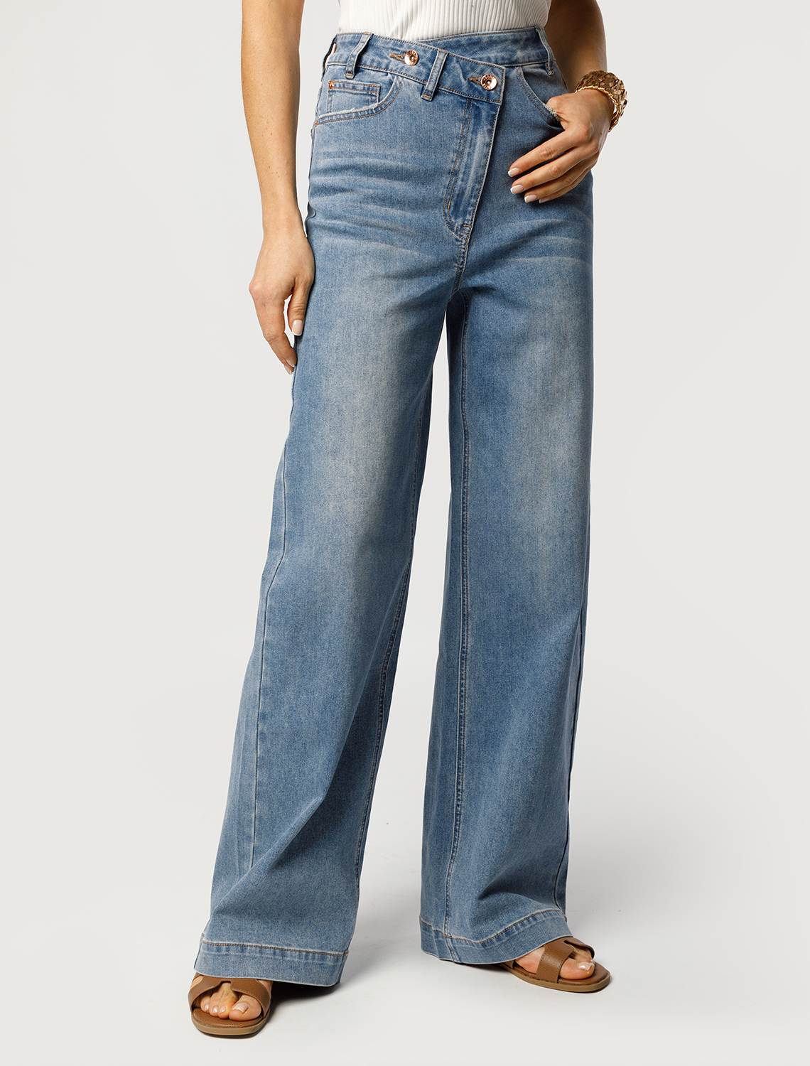 Джинсы-трубы в синем оттенке выполнены из эластичного денима. Модель с трендовой ассиметричной застежкой и декоративной стиркой эффектом делаве. Свободный силуэт и акцент на талии визуально вытягивают силуэт и подчеркивают достоинства фигуры. Изделие дополнено брендированным патчем. 70%Хлопок 28%ПЭ 2%ПУ