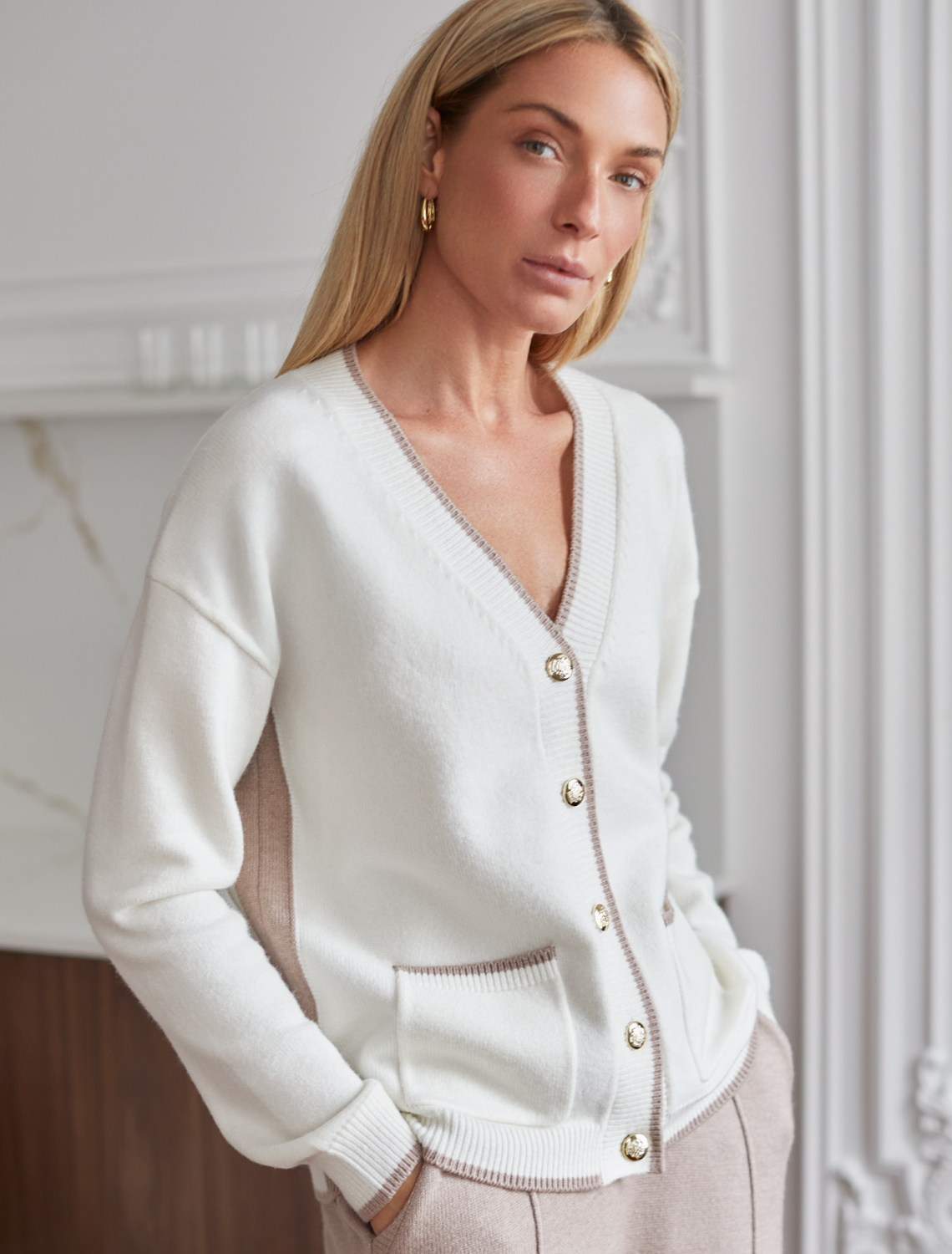 Кардиган выполнен из мягкой меланжевой пряжи с добавлением кашемира. Модель прямого силуэта дополнена контрастными вставками, что позволяет выбрать брюки в тон основного изделия, либо канта. Роскоши добавляют фактурные золотистые пуговицы. Изделие очень приятное к телу, совершенно не колется и отлично сохраняет тепло. Сочетается в костюме с брюками D38.013, D38.012 и юбкой D36.016 52%ПАН (акрил) 33%ПЭ 8%ПУ 7%Кашемир
