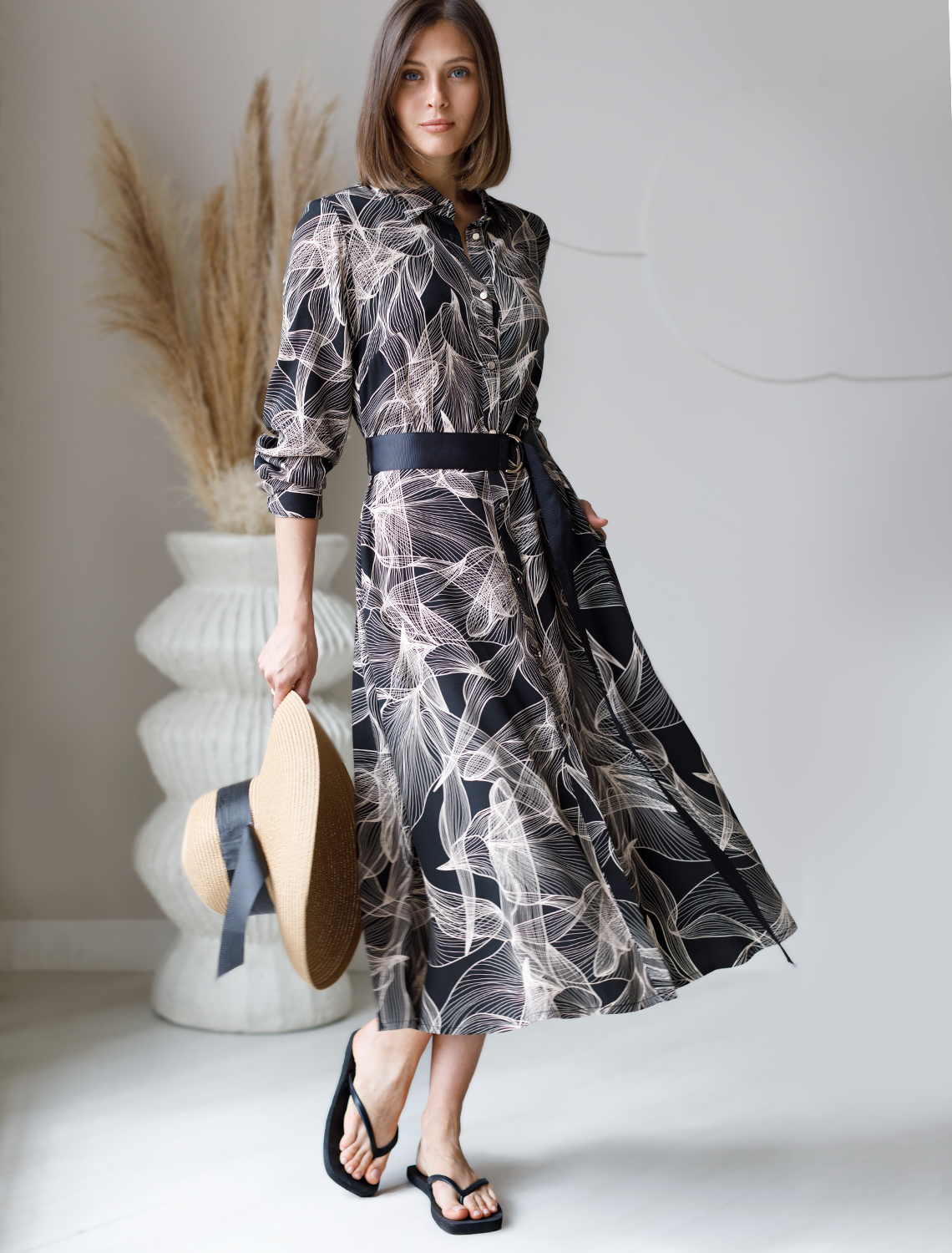 Платье А-силуэта с отложным воротником как у рубашки выполнено из премиальной вискозы. Модель с графичным растительным принтом дополнена удобными боковыми карманами и поясом из репсовой ленты. Застежка на золотистые пуговицы во всю длину изделия позволяем создать спереди нужный разрез. Материал - очень приятен к телу именно в осеннее время за счет его особенного плетения создает уютный обволакивающий эффект и в тоже время не теряет своей легкости. 100%Вис