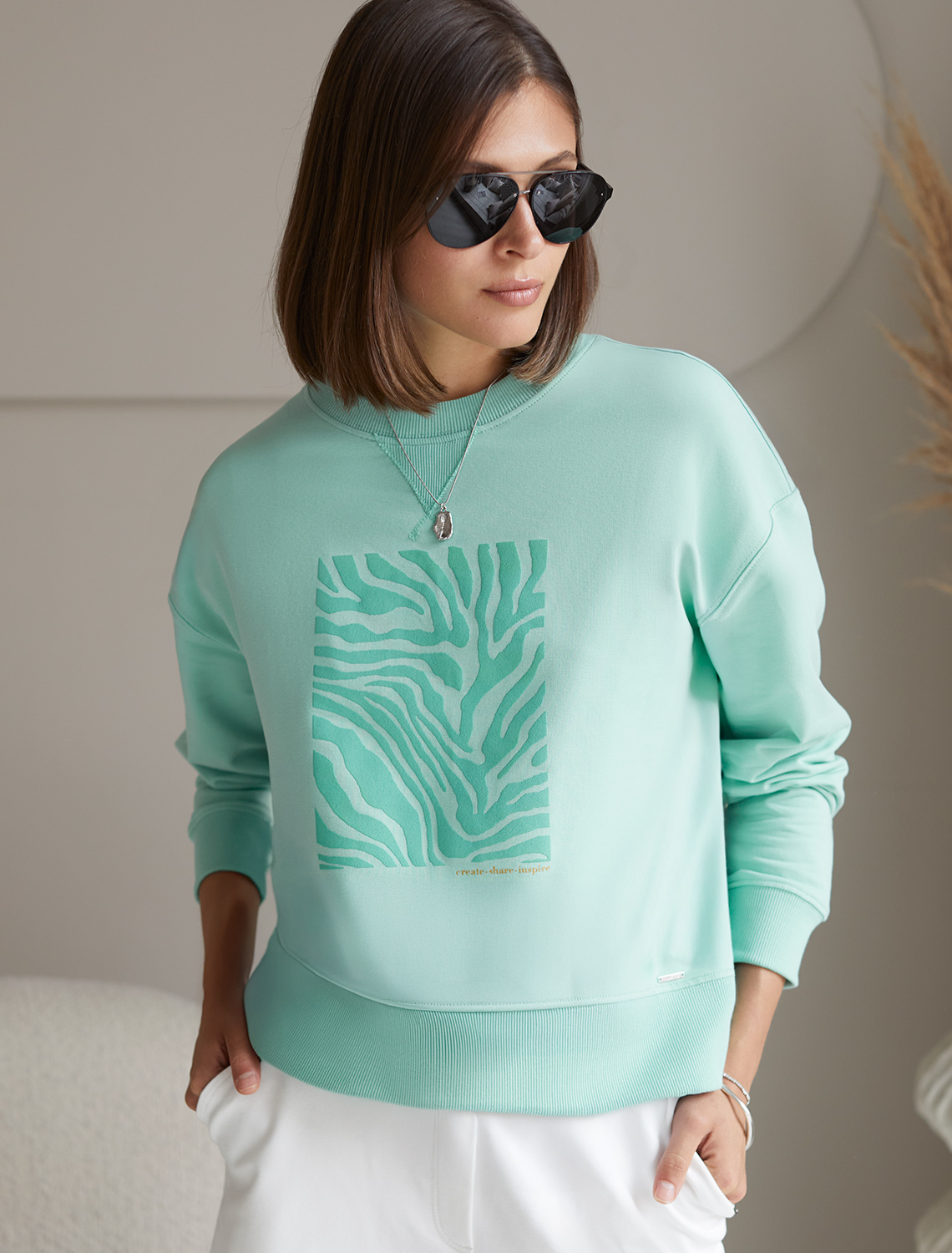 Перевод принта: Create, share, inspire - создавай, делись, вдохновляй. Джемпер среднего объема со спущенным плечом выполнен из футера двухнитки с эластаном. Принт нанесен фактурной краской. Эластичный материал гарантирует комфорт и формоустойчивость. Сочетается в костюме с брюками D44.138, D44.139 и шортами D48.008. Изделие дополнено металлическим логотипом бренда. 95%Хлопок 5%ПУ