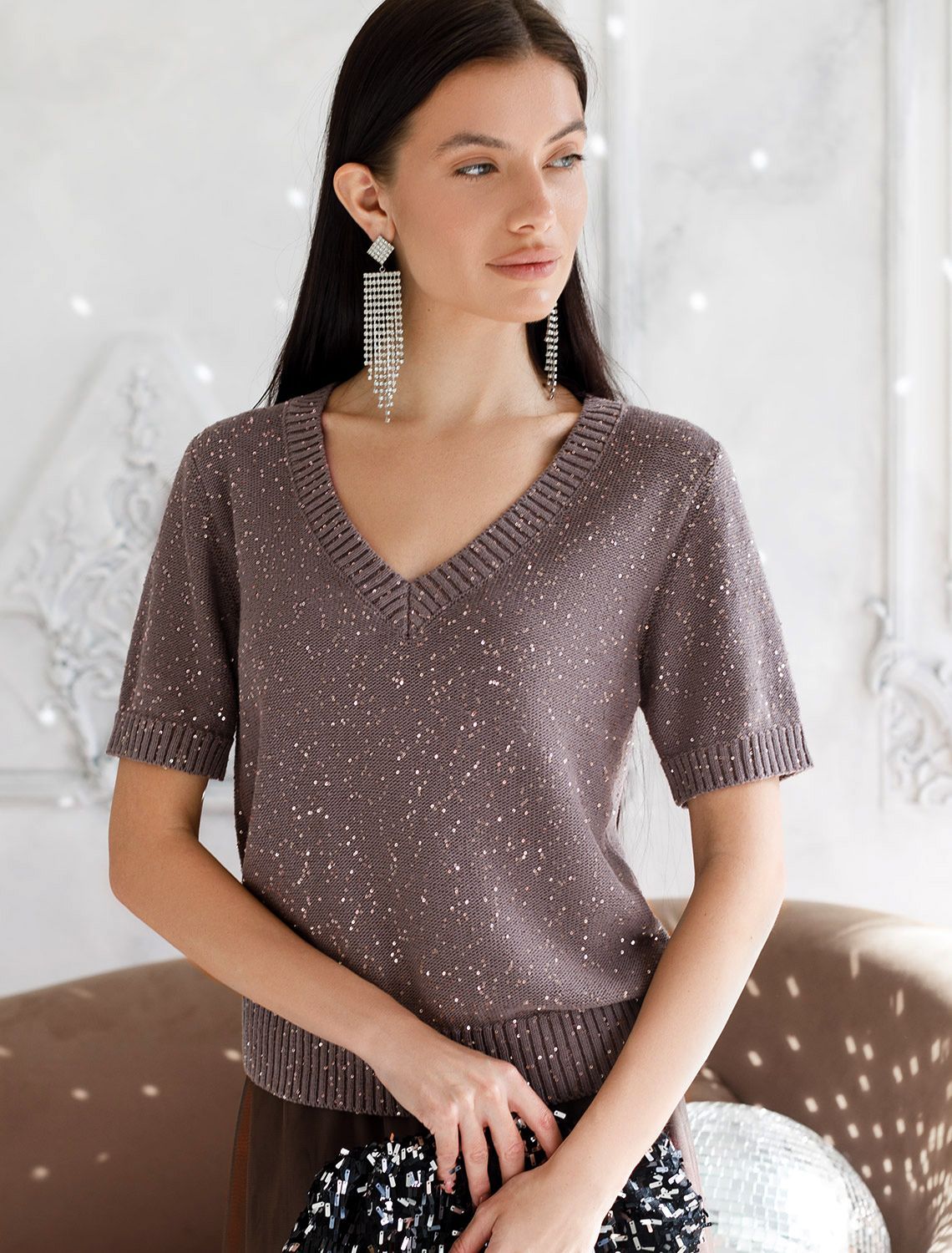 Легкий джемпер кофейного цвета с V вырезом и коротким рукавом выполнен из хлопковой пряжи с вкраплением сияющих пайеток, что придает особую изысканность. Нарядный джемпер связан изнанкой, пряжа отличается легкостью и приятной текстурой, совершенно не колется, обеспечивает комфорт даже при длительном использовании, а натуральные волокна поддерживают оптимальный температурный баланс. Полуприлегающий крой подчеркивает женственный силуэт, а манжеты на рукавах и по низу гармонично завершают дизайн, создающий аккуратный образ. Умеренно открытое декольте вытягивает шею и подчеркивает ее изящество. Стильный джемпер подойдет девушкам и женщинам больших размеров, в нем вы будете чувствовать себя уверенно и свободно в любой ситуации. Мерцающий эффект пайеток добавляет образу выразительности и индивудуальности. Сочетайте джемпер в романтическом образе с пышной юбкой, в более строгом с широкими брюками. Мерцающее полотно добавляет особого шарма вашему образу, делая его уместным как на праздник, так и для повседневного выхода. Новый год, вечеринка или любое другое мероприятие пройдут ярко -- сияющие пайетки создают ощущение праздника в каждом движении. Состав: 90%Хлопок 10%ПЭ