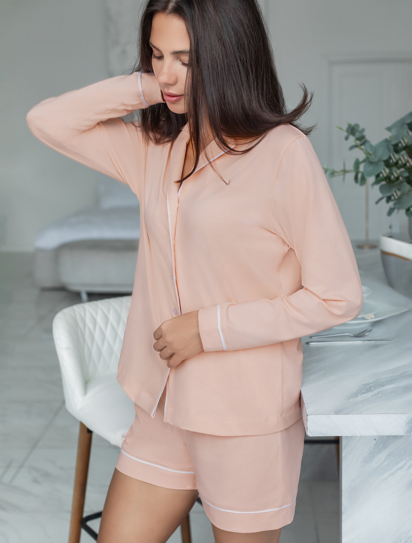 Блузка с английским воротом и длинным рукавом выполнена из эластичного хлопка. Модель дополнена контрастным кантом. Самые мягкие волокна премиального хлопка гарантируют непревзойденный комфорт в течении всего дня. Эластан в составе изделия, поддерживает форму и препятствует сминаемости. Сочетается в костюме с шортами D48.006 и брюками D44.120 92%Хлопок 8%ПУ